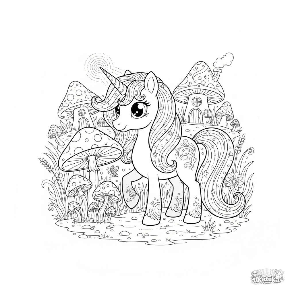 Página para colorir difícil de um pônei mágico pastando em um prado encantado entre cogumelos brilhantes e fadas. Para crianças a partir de 8 anos.