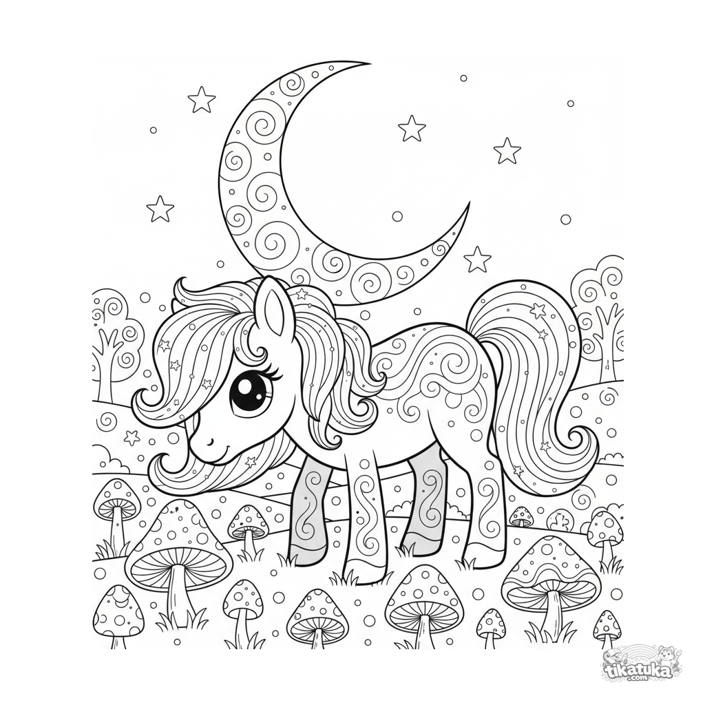 Página para colorir detalhada para crianças maiores de 7-12 anos: um pônei mágico com crina aurora pasta em um prado de cogumelos brilhantes. Cena encantadora e complexa.