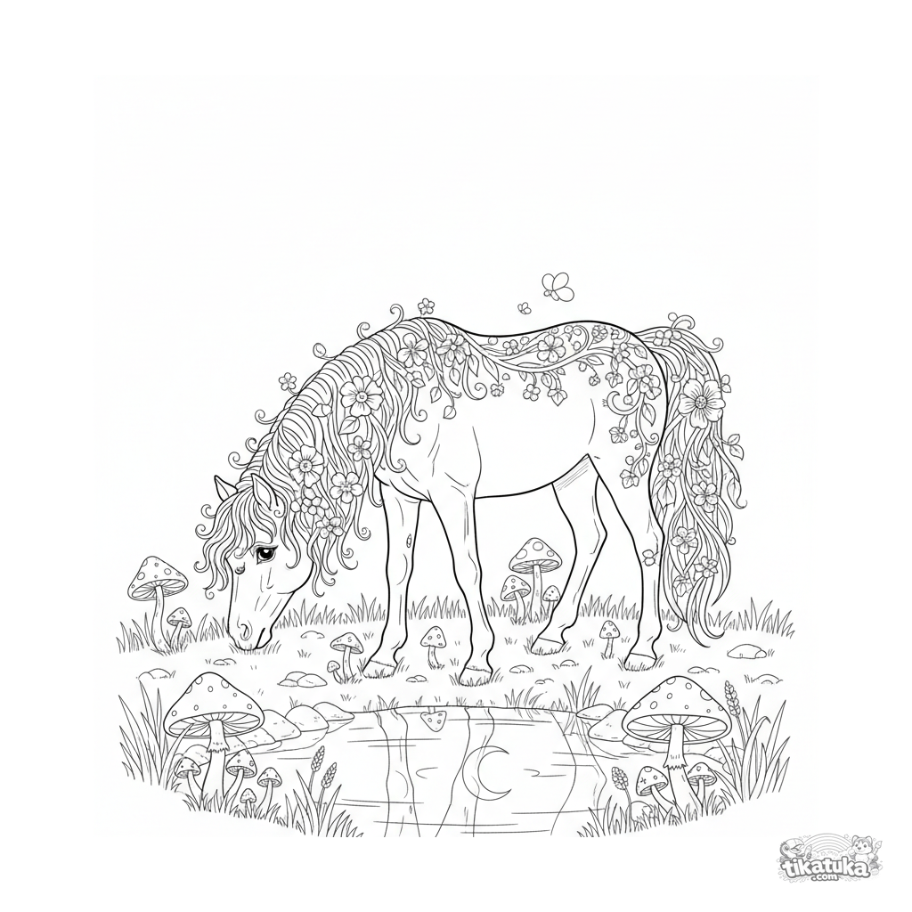 Página para colorir de um pônei mágico com crina de flores, pastando em um prado ao luar. Para crianças de 8 a 12 anos. Cena detalhada com cogumelos brilhantes e um lago refletor.