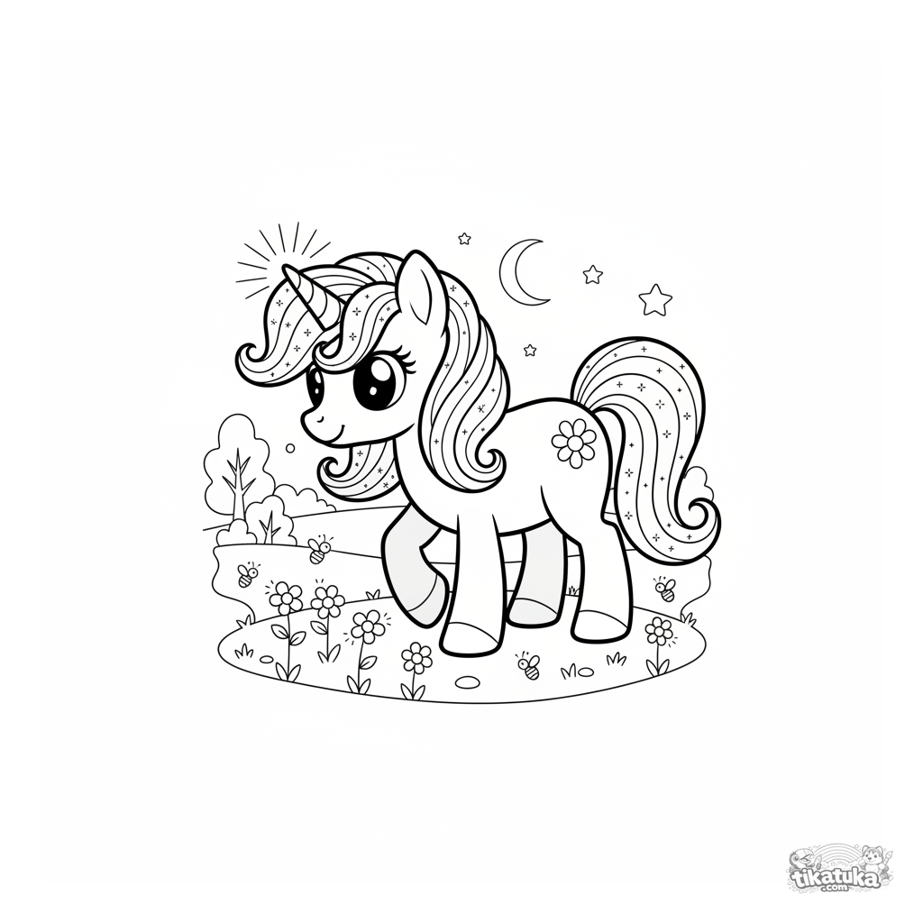 Página para colorir para meninas de 4-6 anos: um pônei mágico com crina de poeira estelar pasta em flores brilhantes em um campo ao crepúsculo.