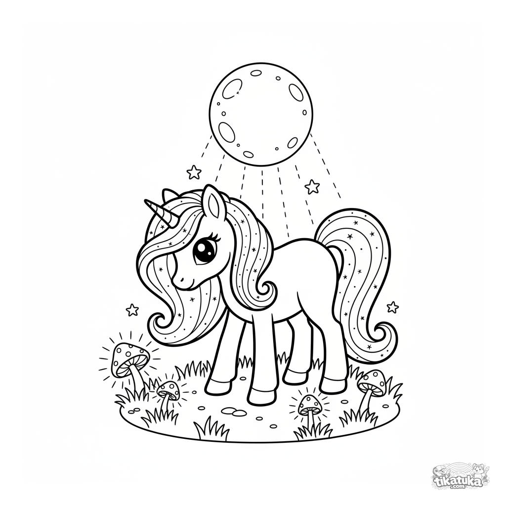 Página para colorir para meninas de 4-6 anos: um pônei mágico com crina estrelada pasta calmamente em um prado ao luar entre cogumelos brilhantes. Cena de conto de fadas.