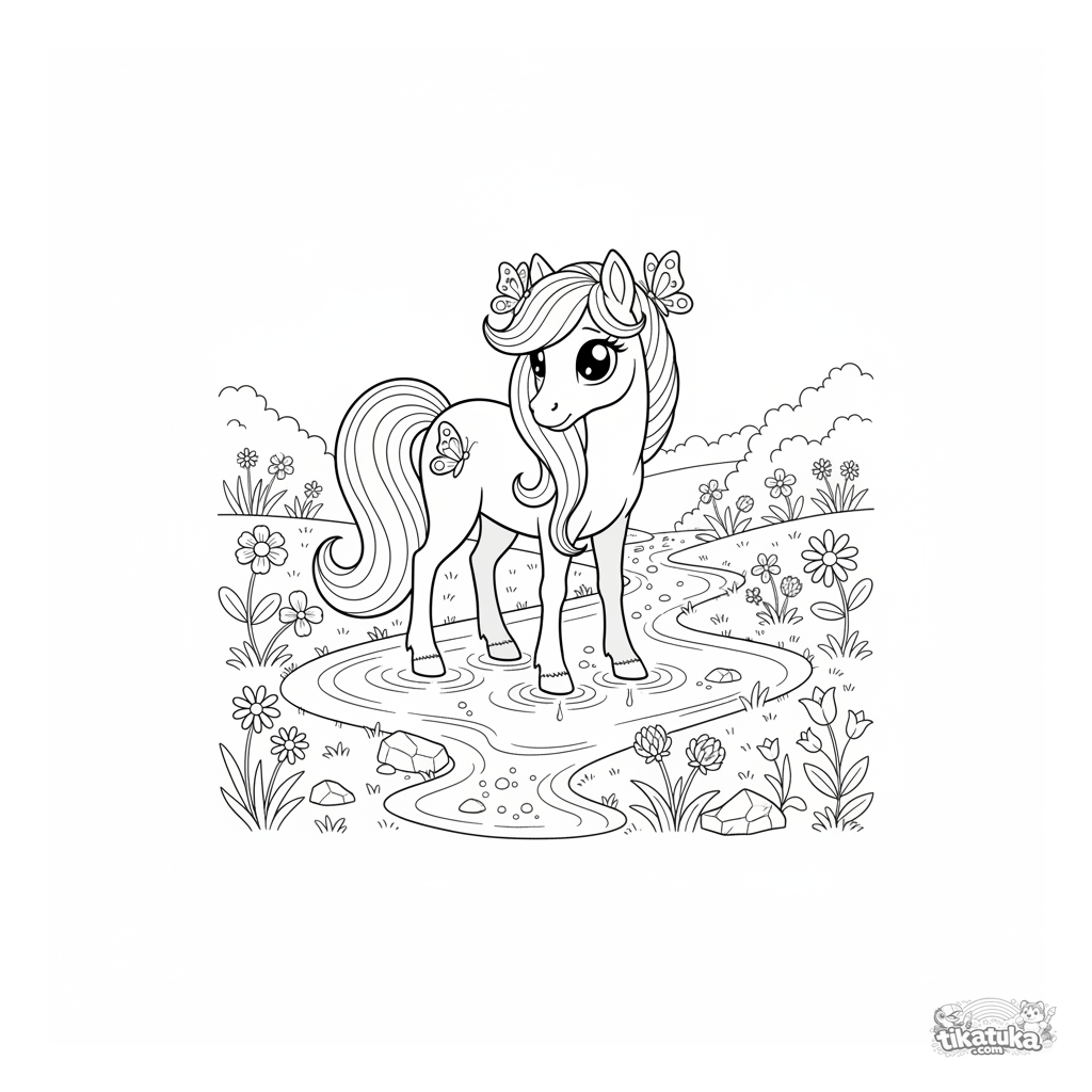 Página para colorir de um pônei mágico com juba de água pastando perto de um riacho cristalino. Para crianças de 4 a 6 anos. Cena com borboletas e flores silvestres.