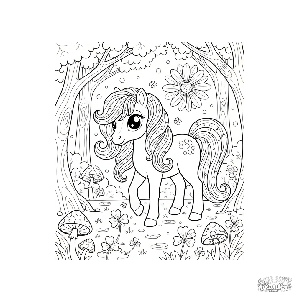 Página para colorir detalhada para meninas mais velhas: um pônei mágico com crina brilhante em uma clareira encantada. Alto detalhe.