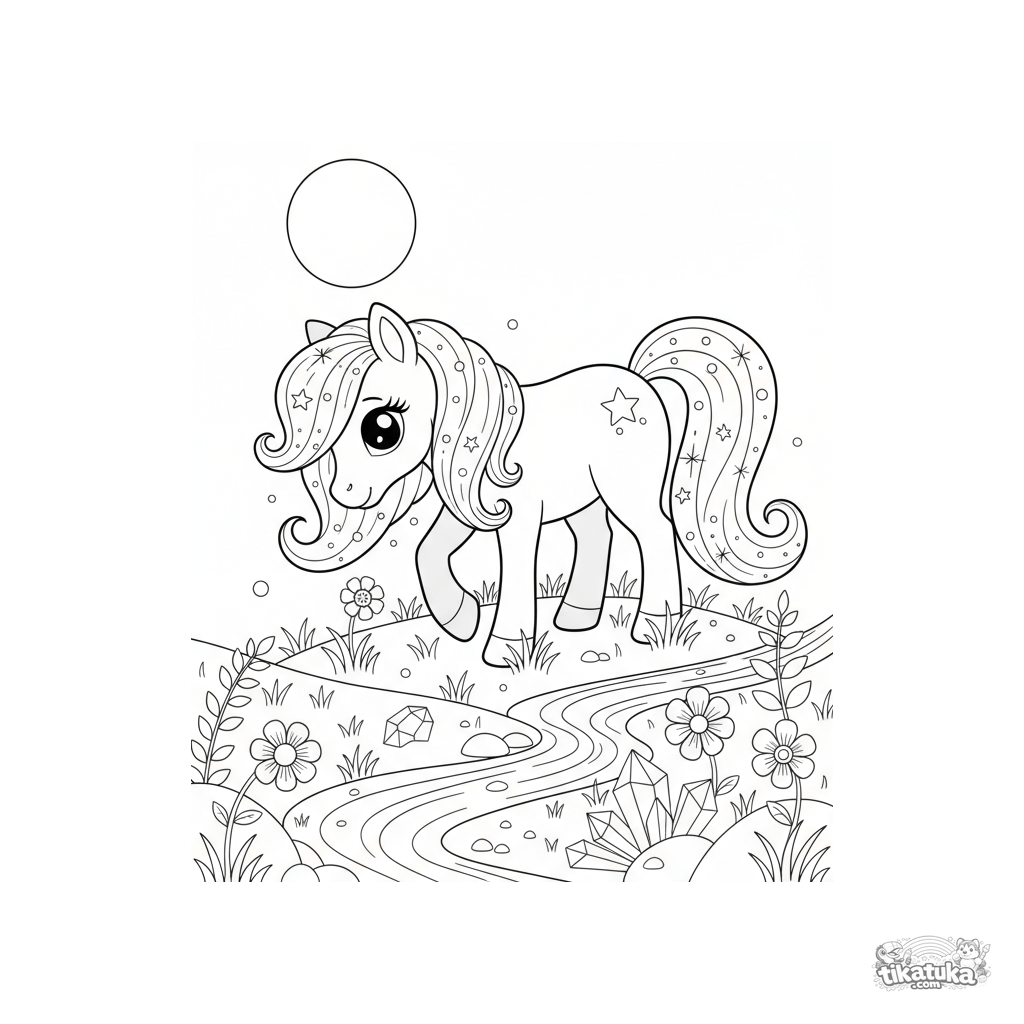 Página para colorir para meninas de 7-12 anos: um pônei mágico com crina estrelada pasta num prado ao luar. Cena encantadora detalhada com elementos bonitos para colorir.