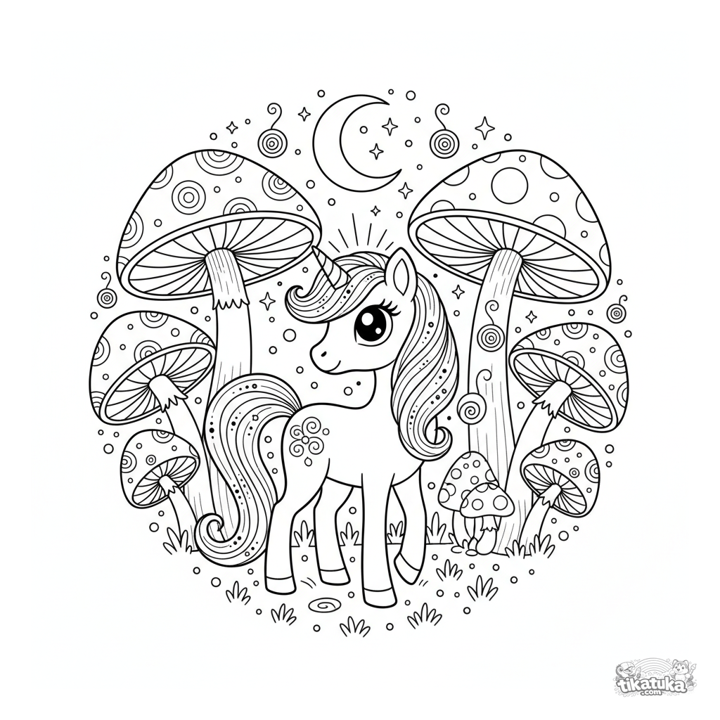 Página para colorir de um pônei mágico pastando em um círculo de cogumelos ao luar. Para crianças de 6 a 9 anos.