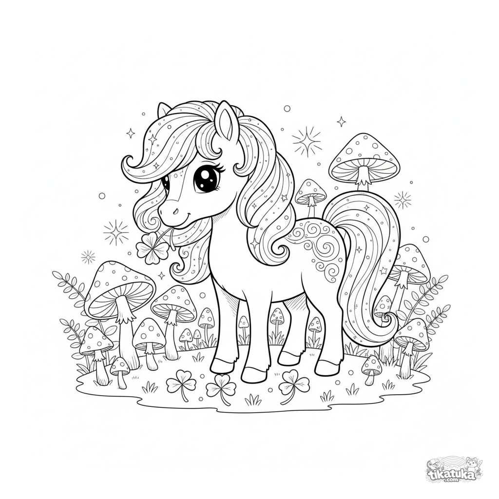 Página para colorir para crianças mais velhas: um pônei mágico com crina brilhante pasta em um bosque encantado. Alto detalhe e elementos de fantasia para 7-12 anos.