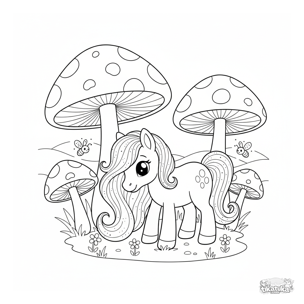 Página para colorir de um pônei mágico com crina brilhante pastando em um prado de cogumelos encantado. Para meninas de 4-6 anos.