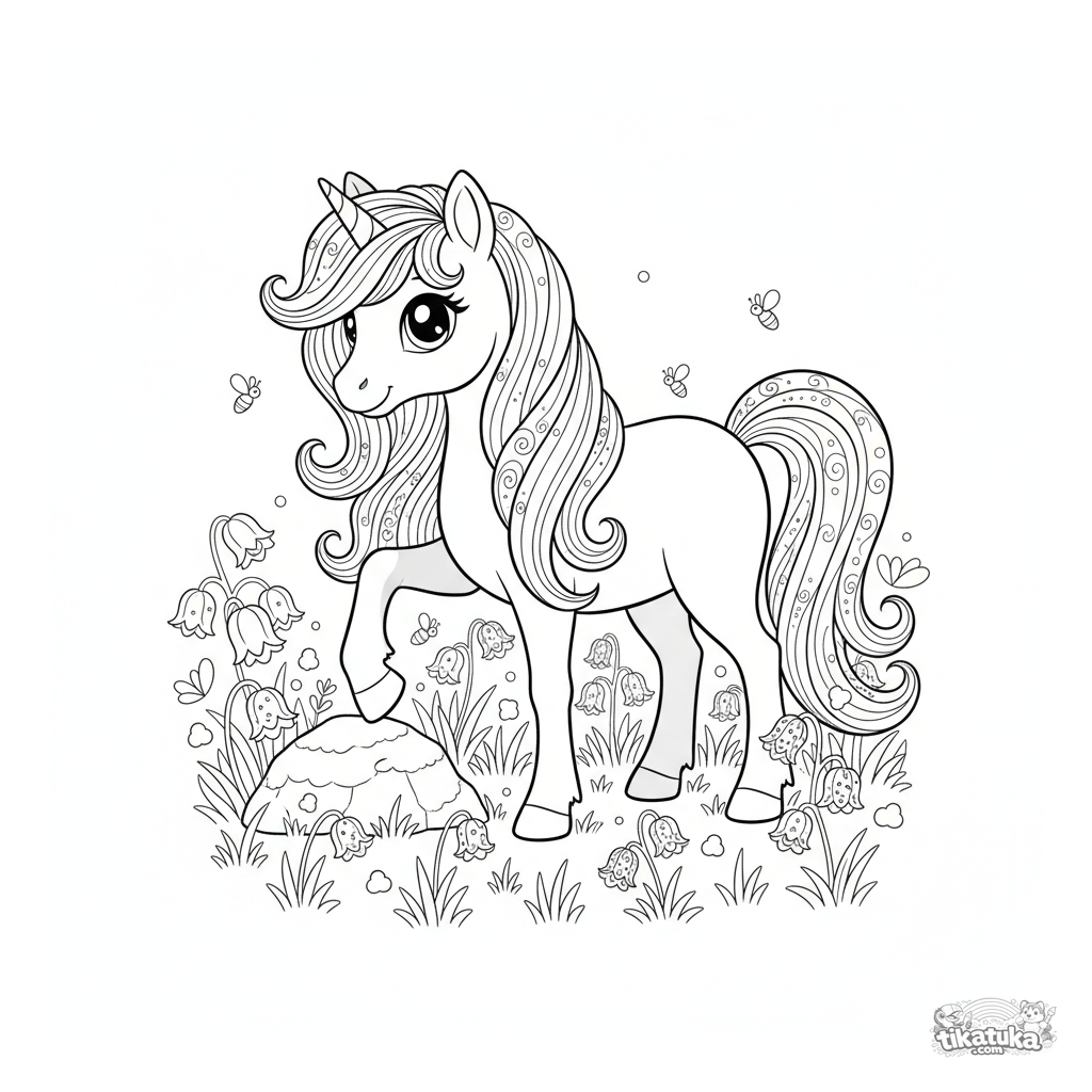 Página para colorir difícil para crianças de 8 a 12 anos: um pônei mágico com crina arco-íris pasta num campo de flores brilhantes com vagalumes.