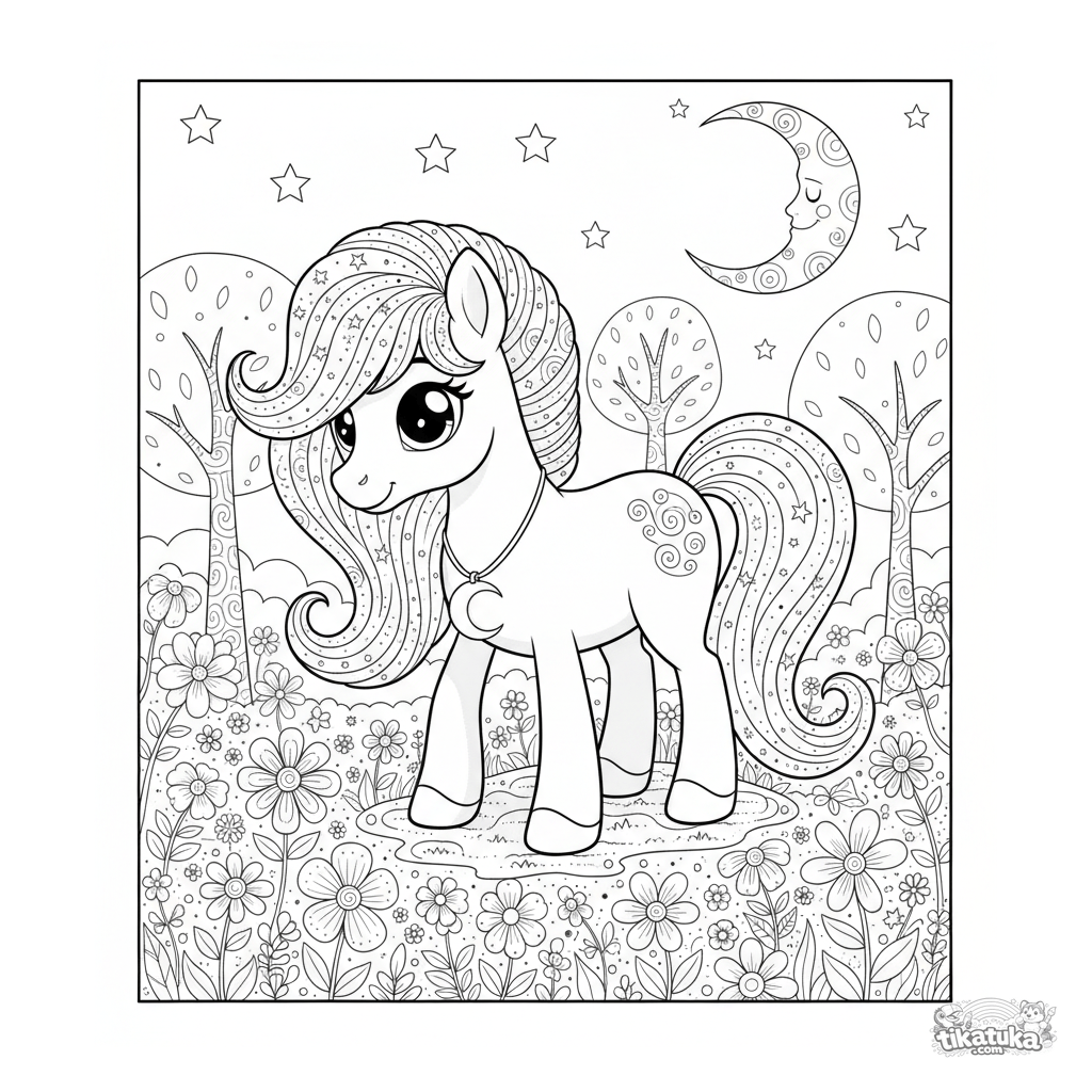 Uma página para colorir de Pôneis com nível Difícil. Ela combina com a idade 6-9 anos, imprime bem em casa e abre imediatamente no modo online.