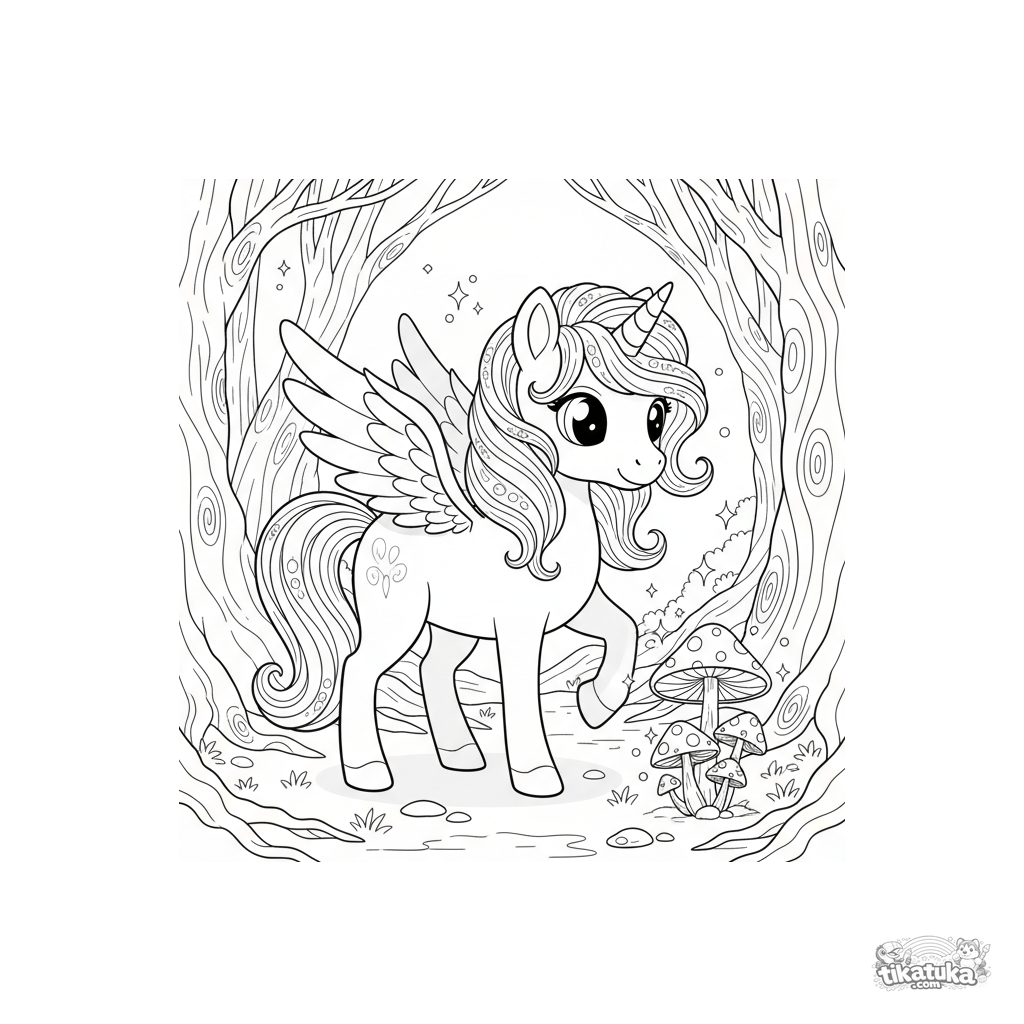 Página para colorir de um pônei unicórnio alado mágico em uma floresta encantada. Para crianças de 5 a 8 anos. O pônei olha para cogumelos brilhantes, luzes cintilantes flutuam ao redor e raízes de árvores antigas são visíveis.