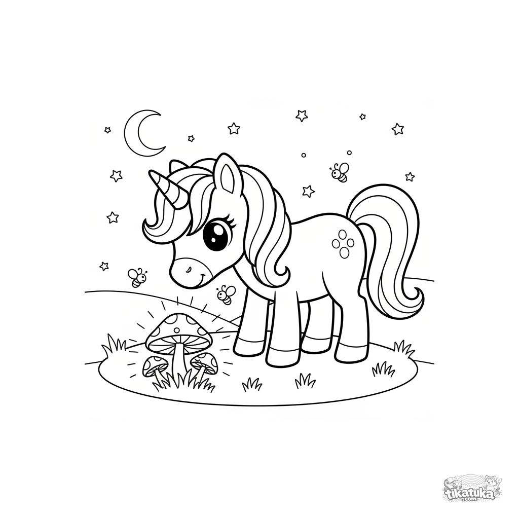 Página para colorir de um pônei unicórnio mágico pastando em um campo ao luar. Para crianças de 3 a 6 anos. Cena mágica e tranquila.