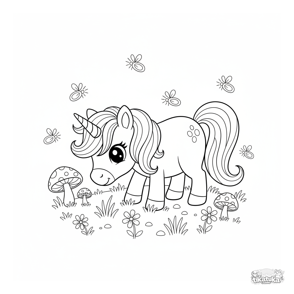 Página para colorir para meninas de 4 a 6 anos. Um pônei unicórnio mágico com crina ondulada pasta em um campo ao luar entre cogumelos brilhantes. Cena de conto de fadas.