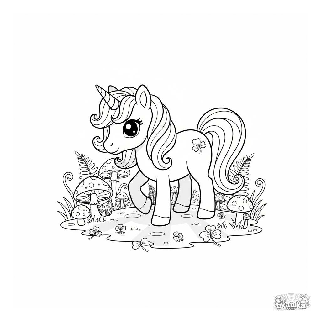 Página para colorir para crianças: um pônei unicórnio mágico com crina longa pasta em um bosque encantado. Adequado para meninas de 4-6 anos.