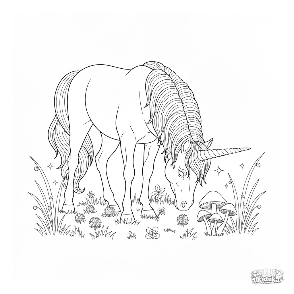 Página para colorir de um gracioso pônei unicórnio pastando em um prado encantado. Para crianças de 6 a 9 anos.