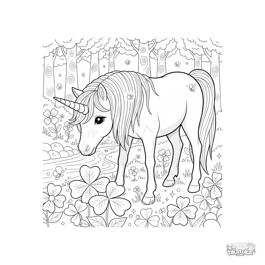 Página para colorir para meninas de 4-6 anos: um lindo unicórnio pasta num prado encantado ao crepúsculo. Linhas realistas mas simples.