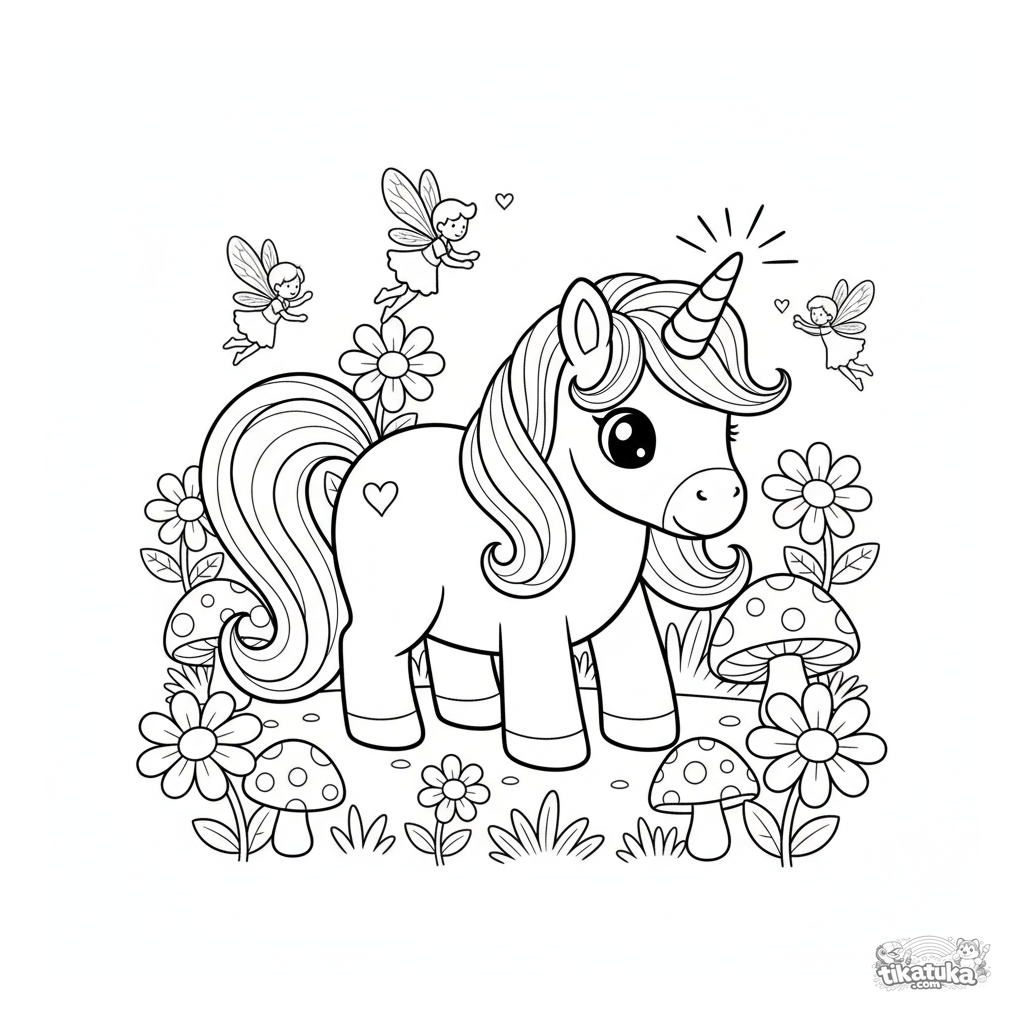 Página para colorir de um pônei unicórnio mágico pastando em um prado encantado. Para crianças de 3 a 6 anos. Cogumelos brilhantes, fadas e contornos simples.
