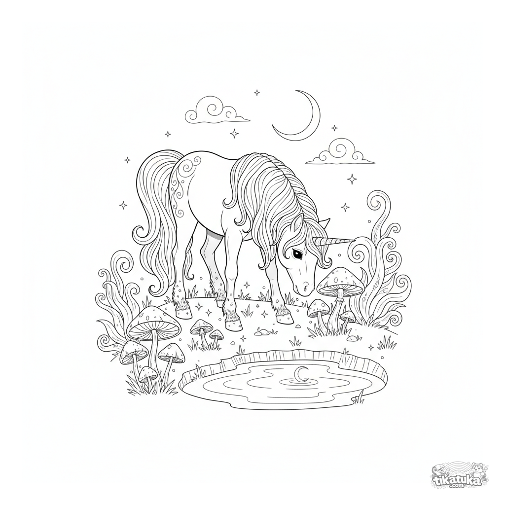Página para colorir para meninas de 7-12 anos: um pônei unicórnio mágico com crina fluente pasta em cogumelos brilhantes em um bosque encantado iluminado pela lua. Cena detalhada com estrelas e vaga-lumes.