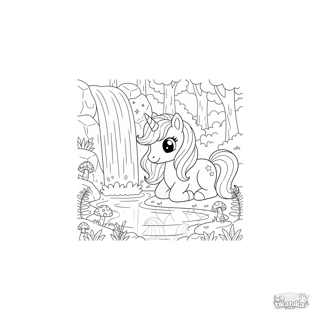 Página para colorir para meninas 4-6: um unicórnio mágico descansa perto de uma cachoeira cintilante em uma floresta encantada. Cena de conto de fadas com linhas simples.