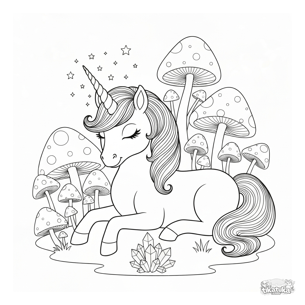Página para colorir de um pônei unicórnio mágico descansando em um bosque de cogumelos brilhantes. Para crianças de 6 a 9 anos.