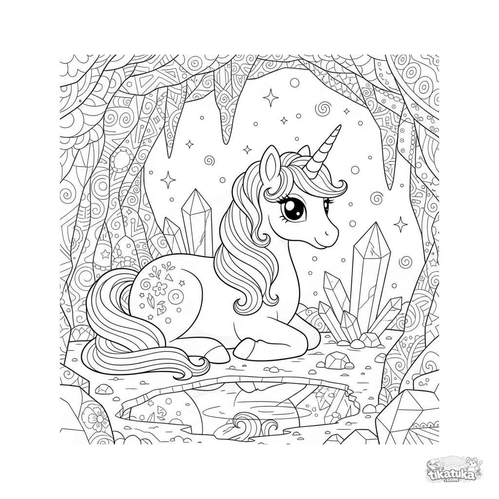 Página para colorir de um pônei unicórnio mágico descansando em uma caverna de cristais cintilantes. Para meninas de 5 a 8 anos.