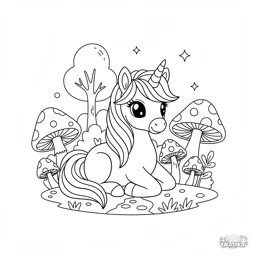 Página para colorir para meninas 4-6: um pônei unicórnio mágico descansa em uma clareira encantada da floresta entre cogumelos brilhantes. Linhas bonitas e fluidas.