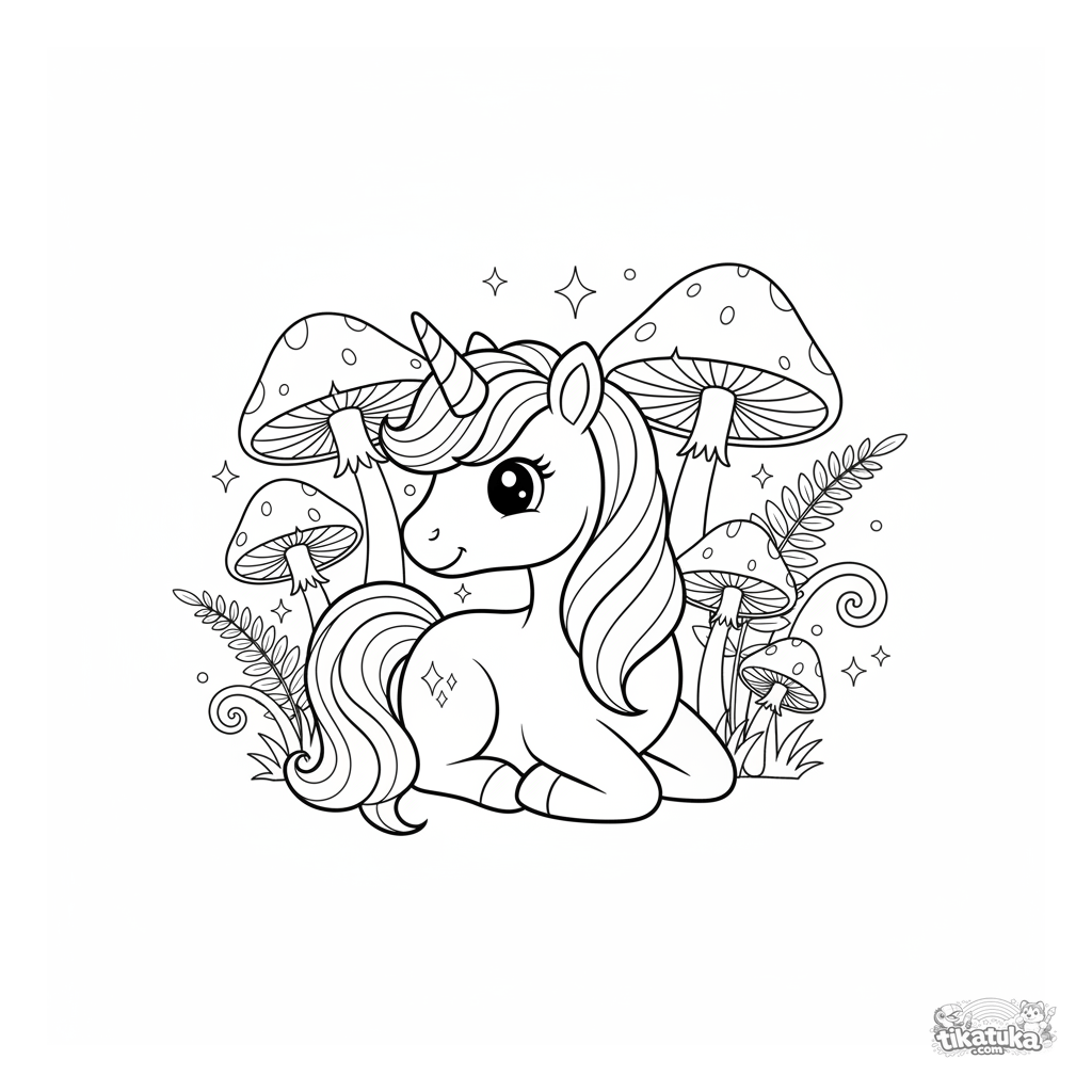 Página para colorir para meninas de 4-6 anos: um pônei unicórnio mágico descansando em um bosque encantado entre cogumelos brilhantes. Detalhes agradáveis e linhas fluidas.