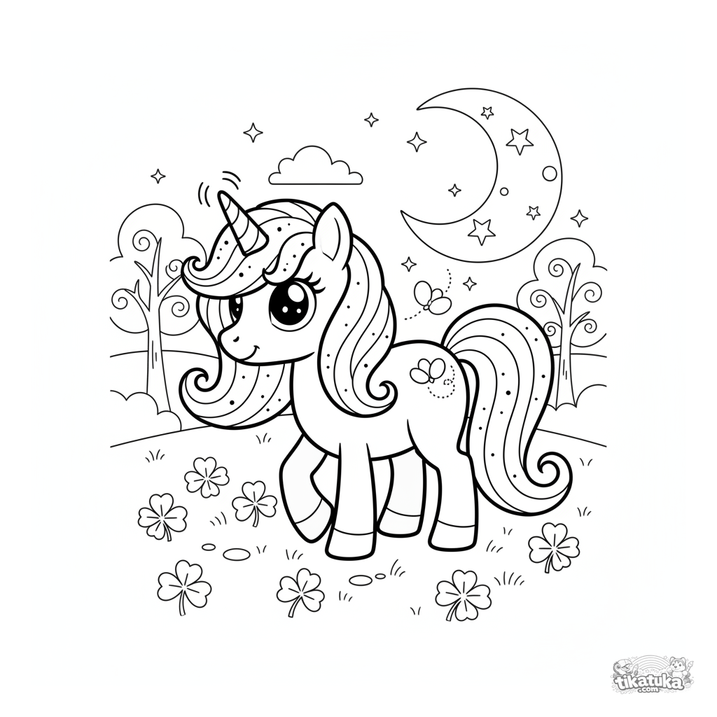 Página para colorir para meninas de 4-6 anos: um pônei unicórnio mágico com crina brilhante pasta em um prado iluminado pela lua. Cena mágica com vaga-lumes.