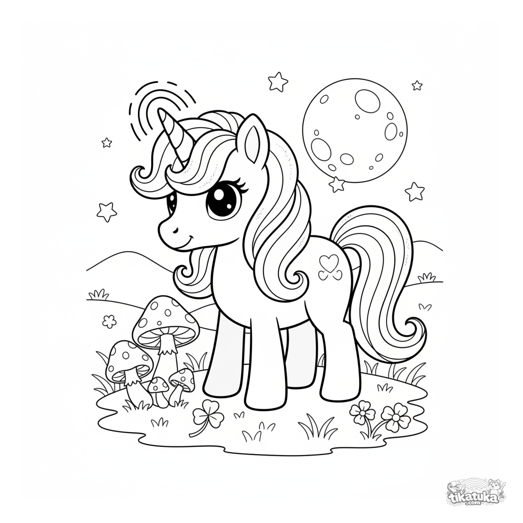 Página para colorir para meninas 4-6: um pônei unicórnio mágico com crina brilhante pasta em um campo iluminado pela lua com cogumelos brilhantes.