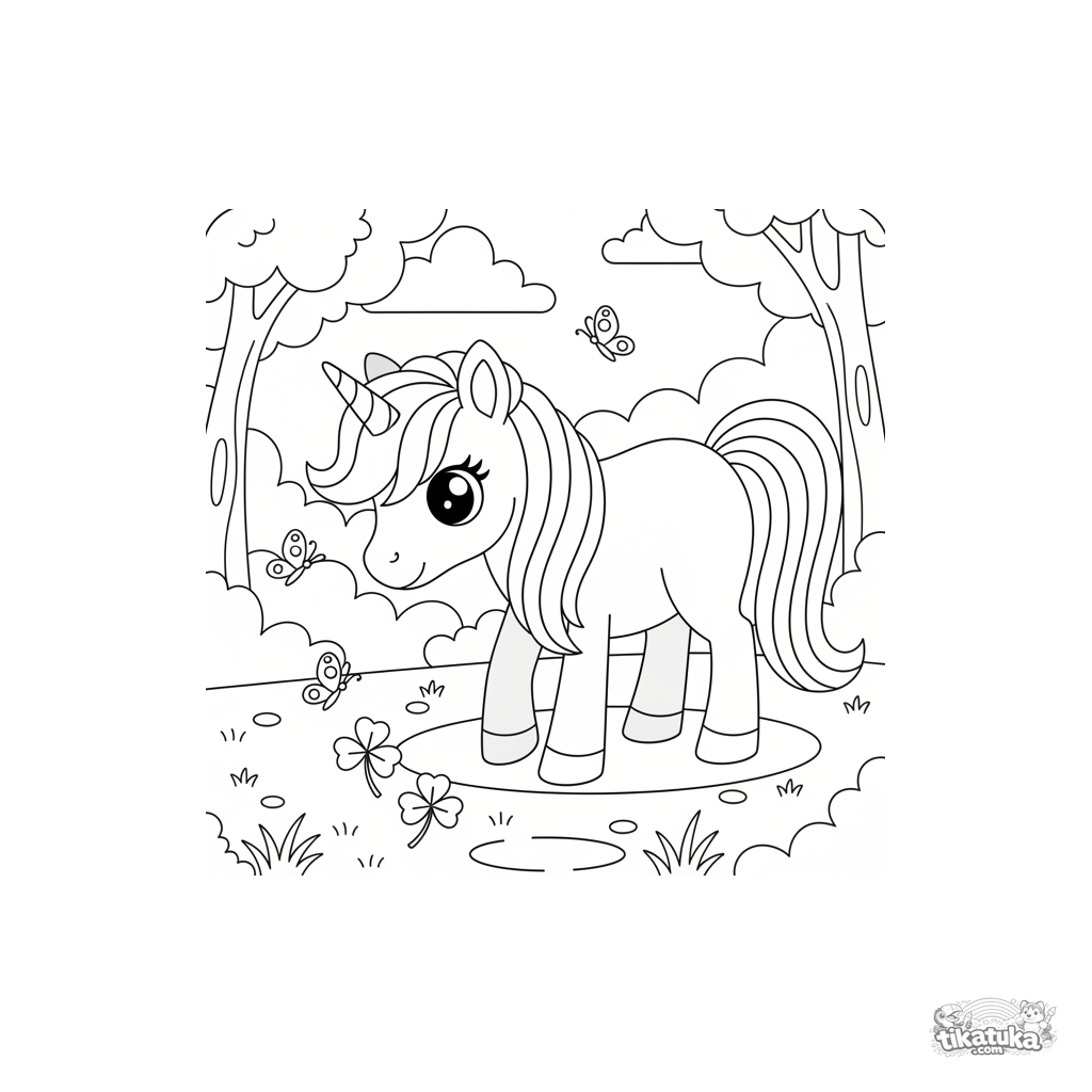 Página para colorir de um pônei unicórnio mágico pastando em um campo ensolarado. Para meninas de 4 a 6 anos. Tem crina arco-íris, chifre brilhante e borboletas ao redor.