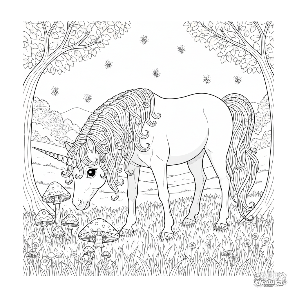 Página para colorir detalhada para crianças mais velhas: um pônei unicórnio mágico pastando sob a luz do luar perto de cogumelos brilhantes. Alto detalhe para 7-12 anos.