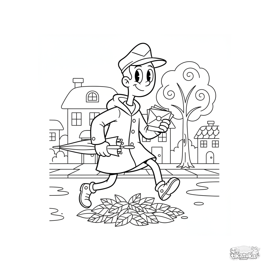 Página para colorir para crianças de 4-6 anos: um carteiro com capa de chuva amarela anda pela calçada molhada entregando cartas sob chuva de outono. Personagem vibrante.