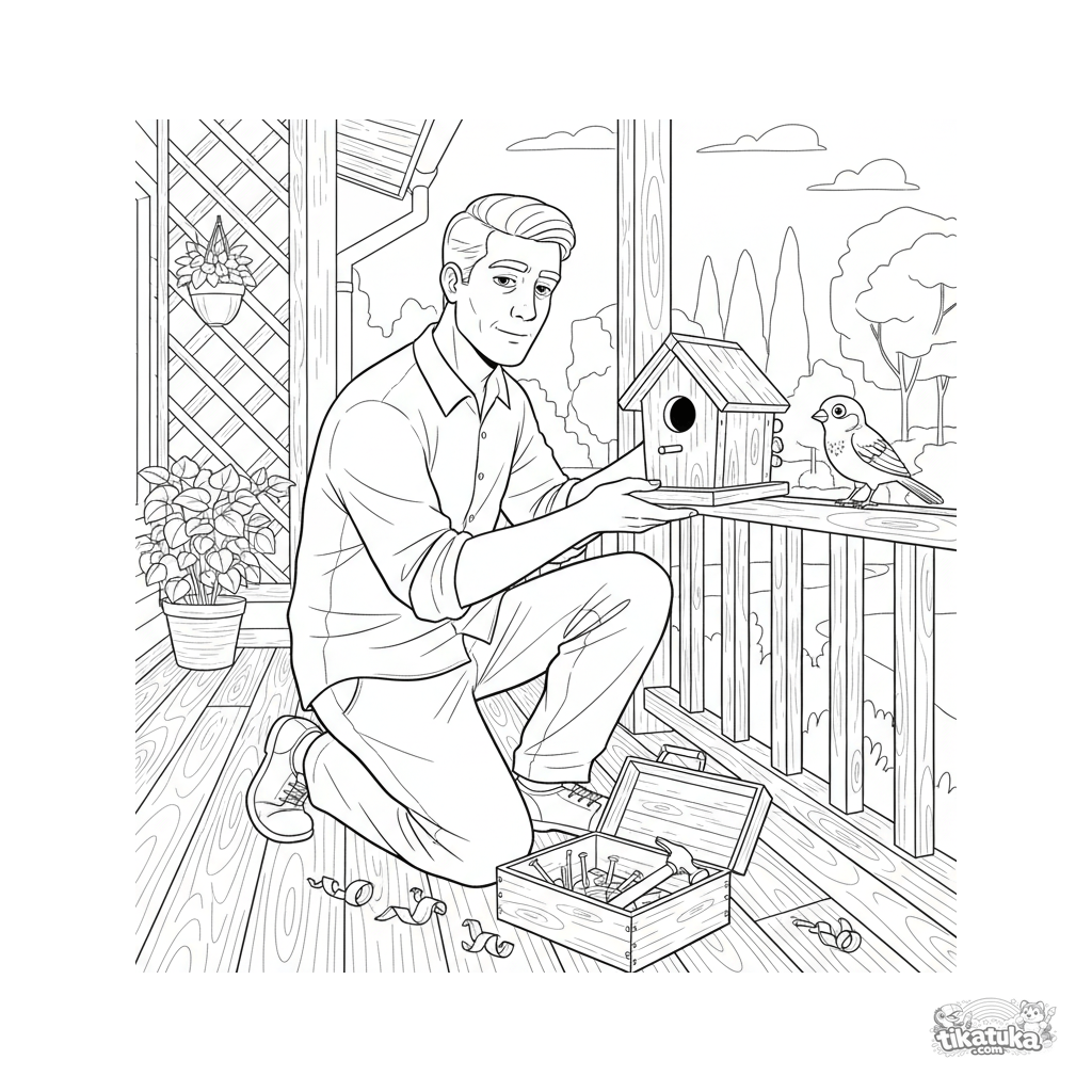 Página detalhada para colorir para crianças de 10-12 anos: um homem consertando uma casa de pássaro no corrimão da varanda de uma casa de campo. Cena com ferramentas, aparas e um pássaro.
