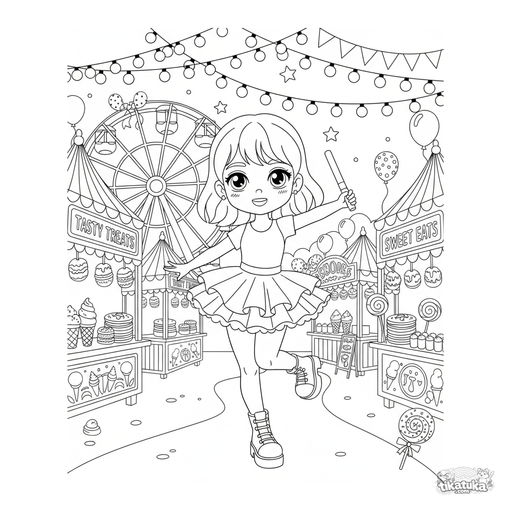 Página para colorir estilo mangá para crianças de 7 a 12 anos: uma dançarina de rua kawaii sob luzes de fada em uma feira noturna vibrante. Cena muito detalhada.