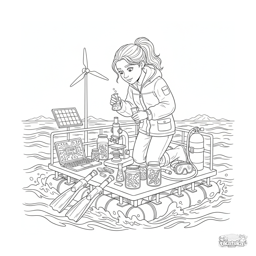 Página para colorir para 10-12 anos: laboratório de pesquisa marinha em uma plataforma flutuante. Um cientista examina amostras de água cercado por equipamentos. Cena complexa e detalhada.