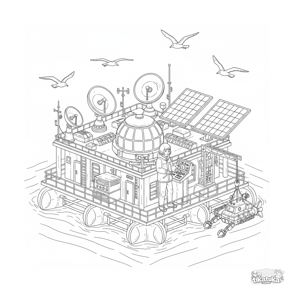 Página para colorir para 10-12 anos: uma estação de pesquisa marinha detalhada em uma plataforma flutuante. Cientistas, instrumentos e um robô submersível em mar aberto.