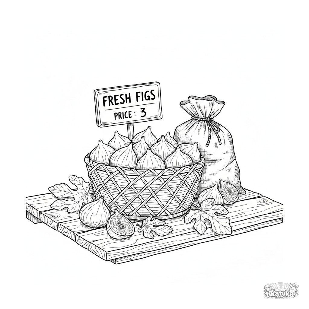 Página para colorir intrincada para 10-12 anos: uma cesta de figos maduros em uma barraca de feira. Cena detalhada no estilo gravura vintage.