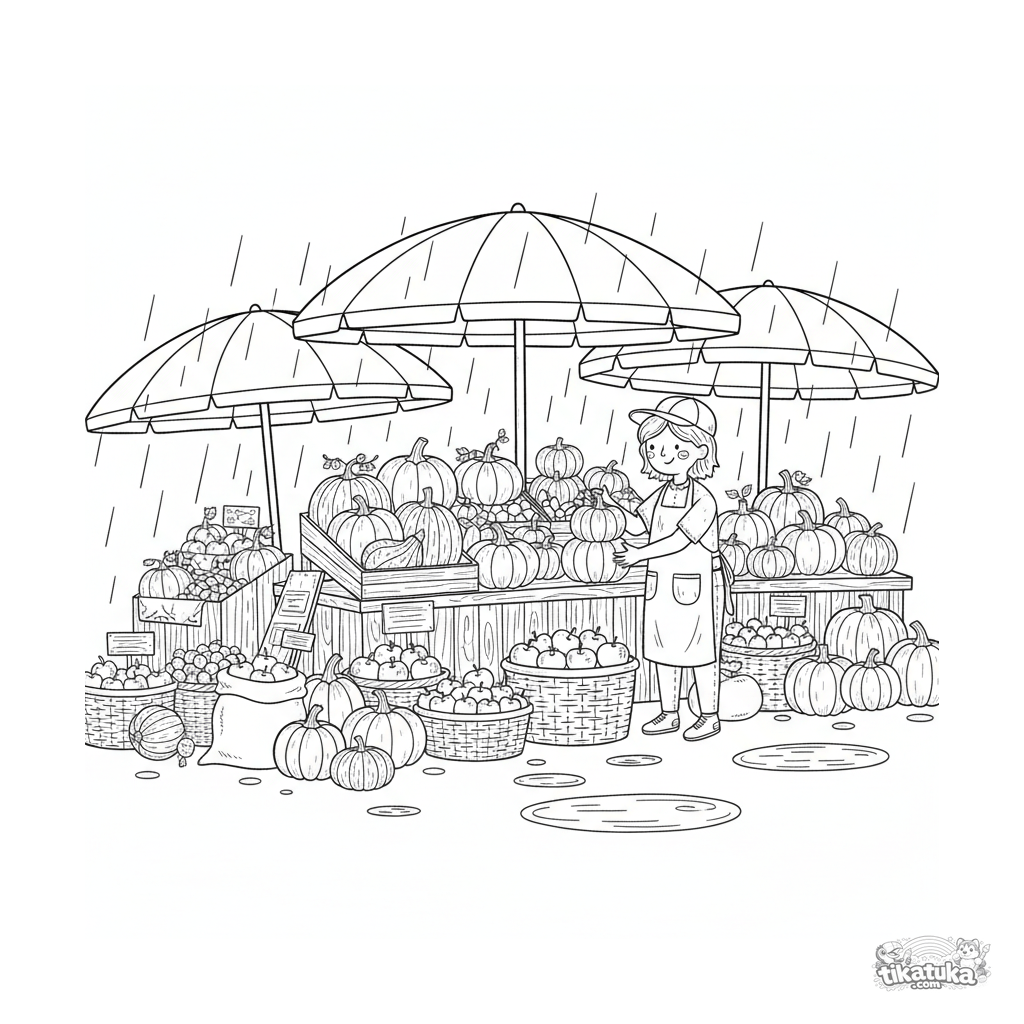 Página para colorir para crianças de 10-12 anos: cena detalhada de um mercado de outono com abóboras e guarda-sóis na chuva. Muitos elementos, texturas, atmosfera de colheita.