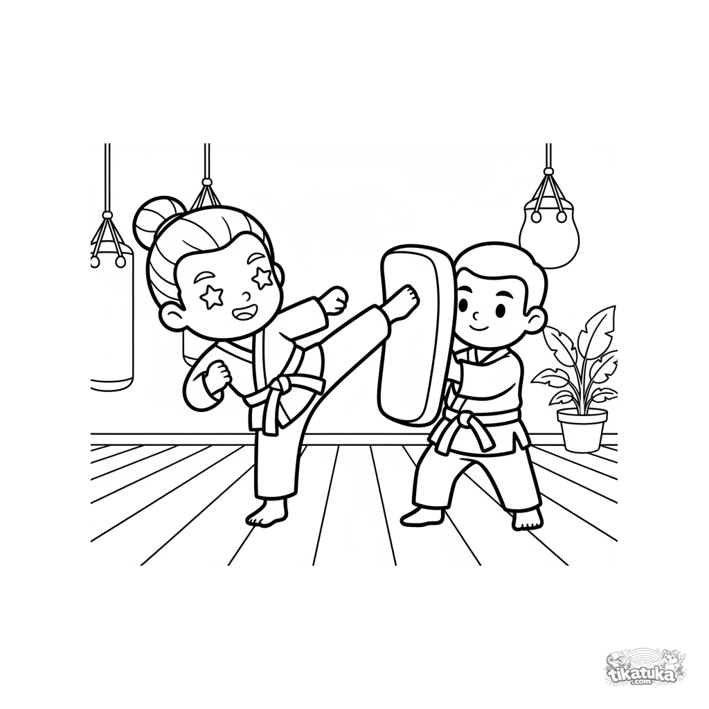 Página para colorir para crianças 4-6: um artista marcial em um quimono branco executa um chute lateral alto contra um alvo de treino em um dojo. Cena de poder e disciplina.