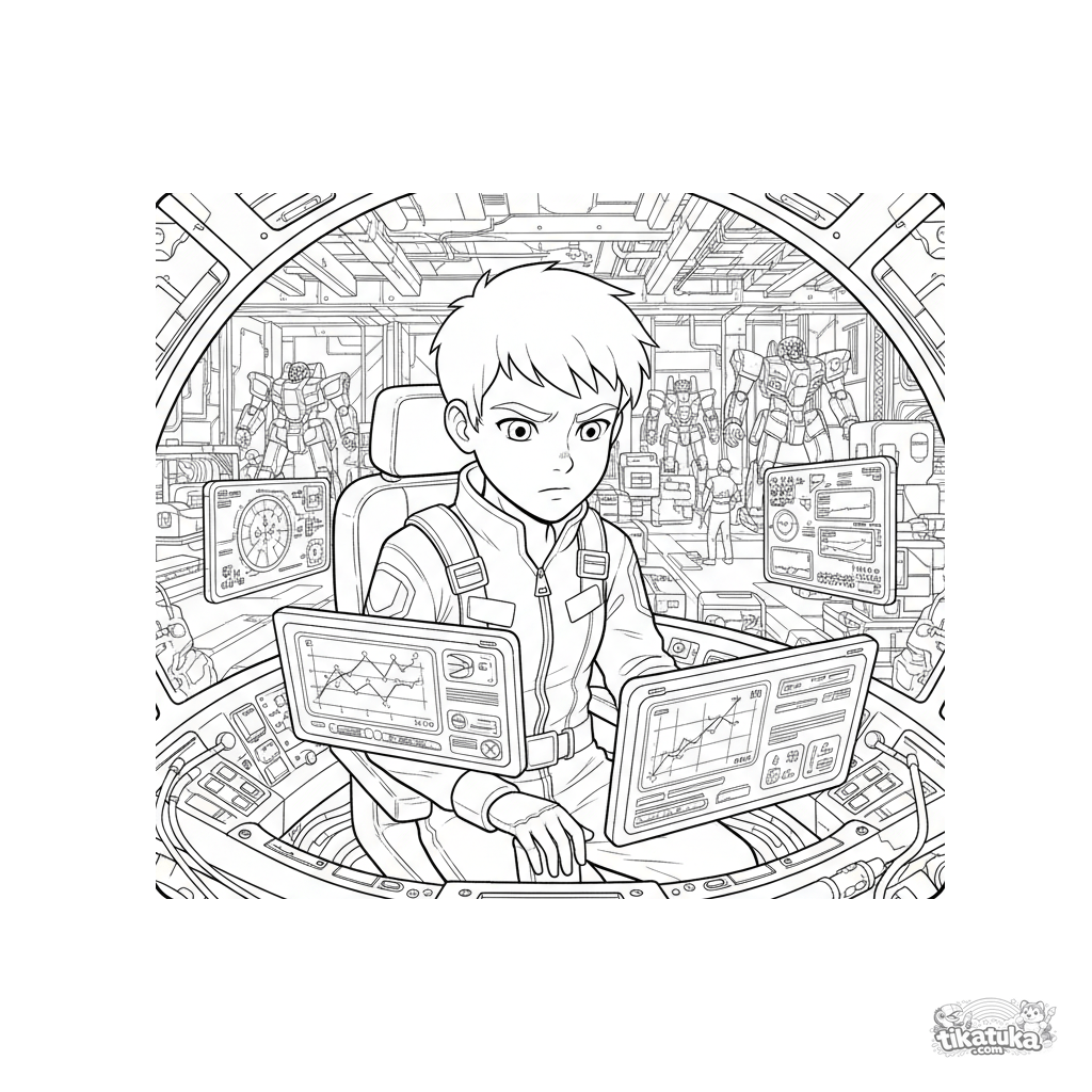 Página para colorir anime detalhada: um piloto de mecha executa diagnósticos em uma cabine de alta tecnologia antes do lançamento. Cena intrincada com hologramas e detalhes interiores para 10-12 anos.