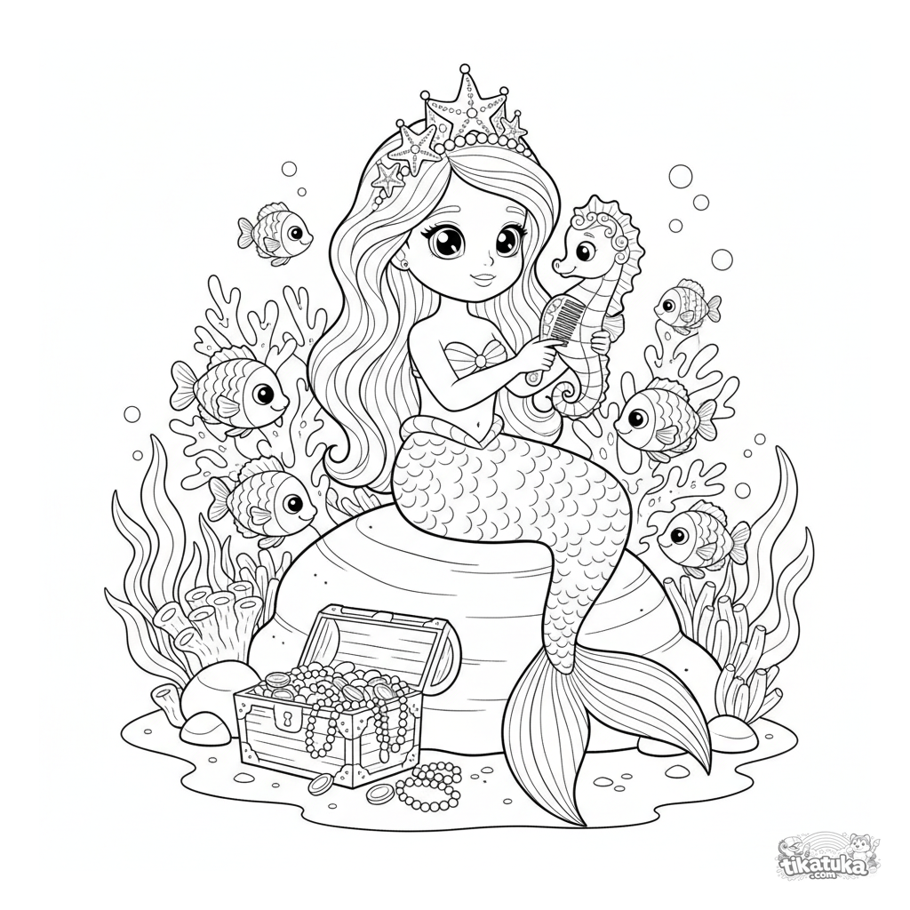 Página para colorir para meninas: uma princesa sereia penteia o cabelo em um recife de coral. Para crianças de 6 a 9 anos. Com um cavalo-marinho, peixes e um baú do tesouro.