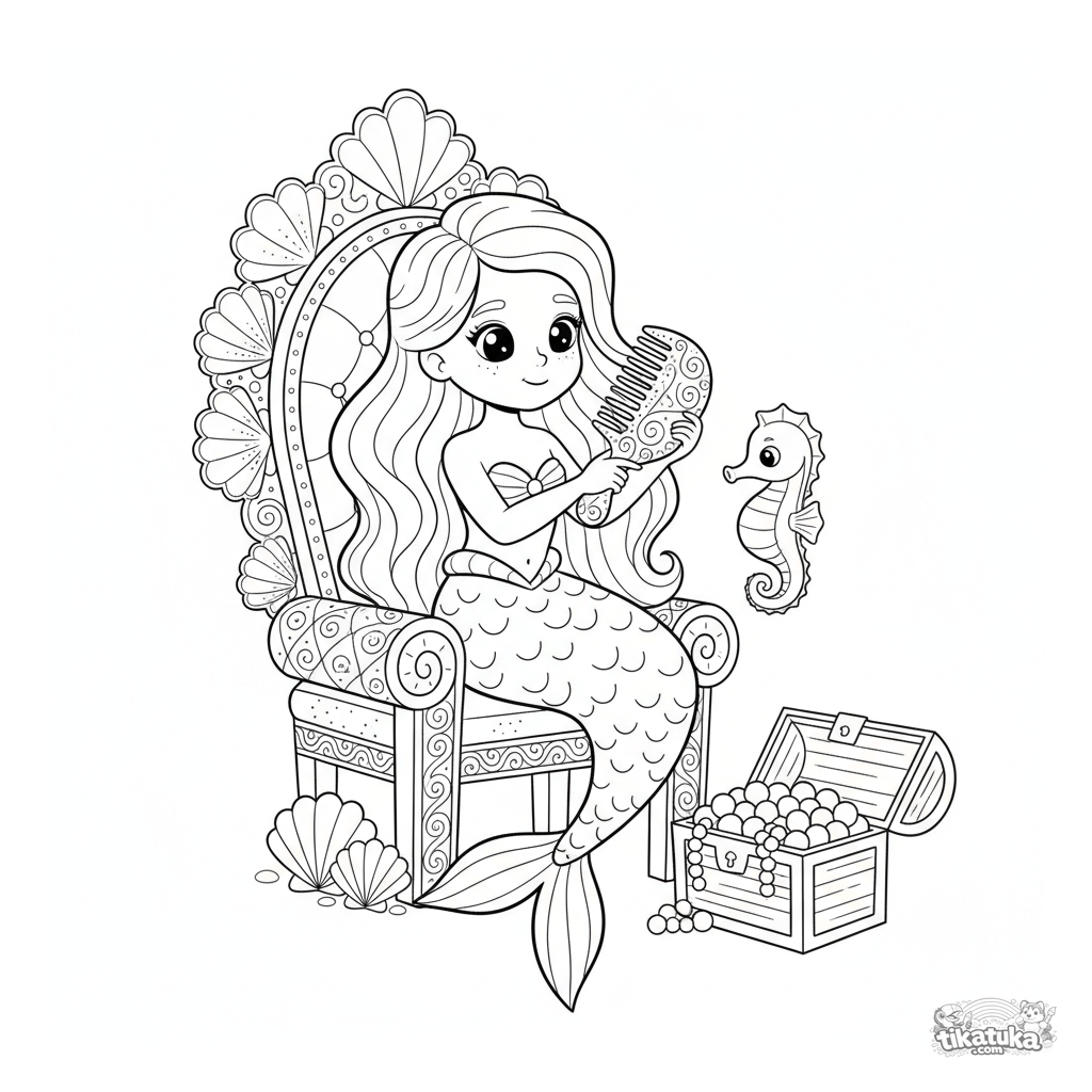 Página para colorir de uma princesa sereia penteando o cabelo em um trono de coral. Para meninas de 6 a 9 anos.
