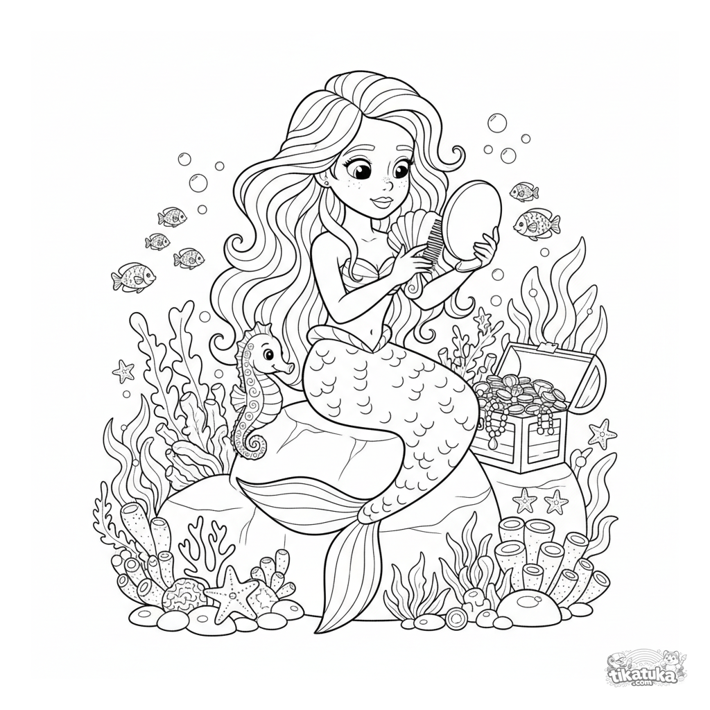 Página para colorir de uma princesa sereia penteando o cabelo em um recife de coral. Para meninas de 6 a 9 anos. Cena detalhada com tesouro e cavalo-marinho.