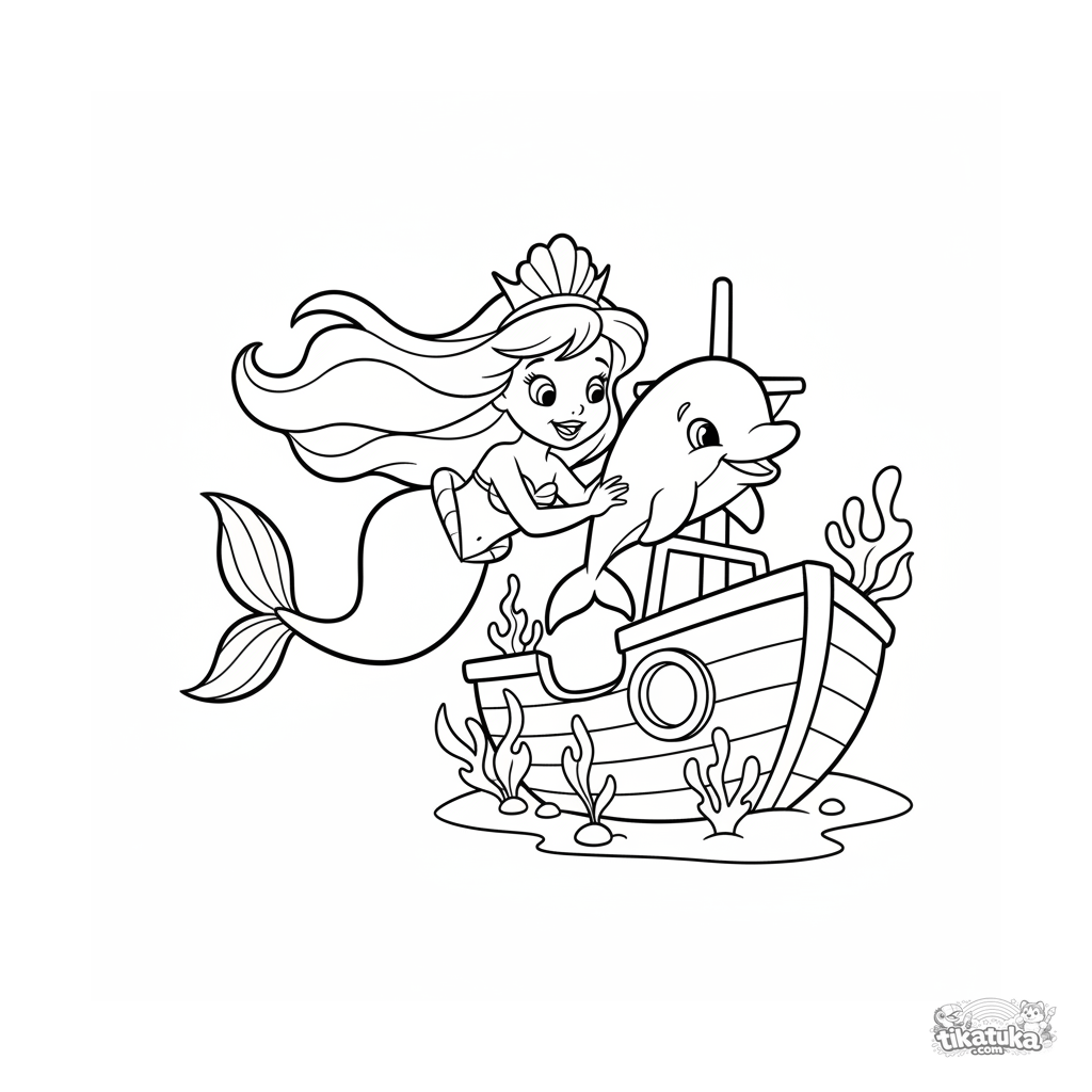 Página para colorir simples para crianças pequenas 2-3: uma princesa sereia fofa com um golfinho nada ao redor de um navio naufragado. Formas grandes e simples.