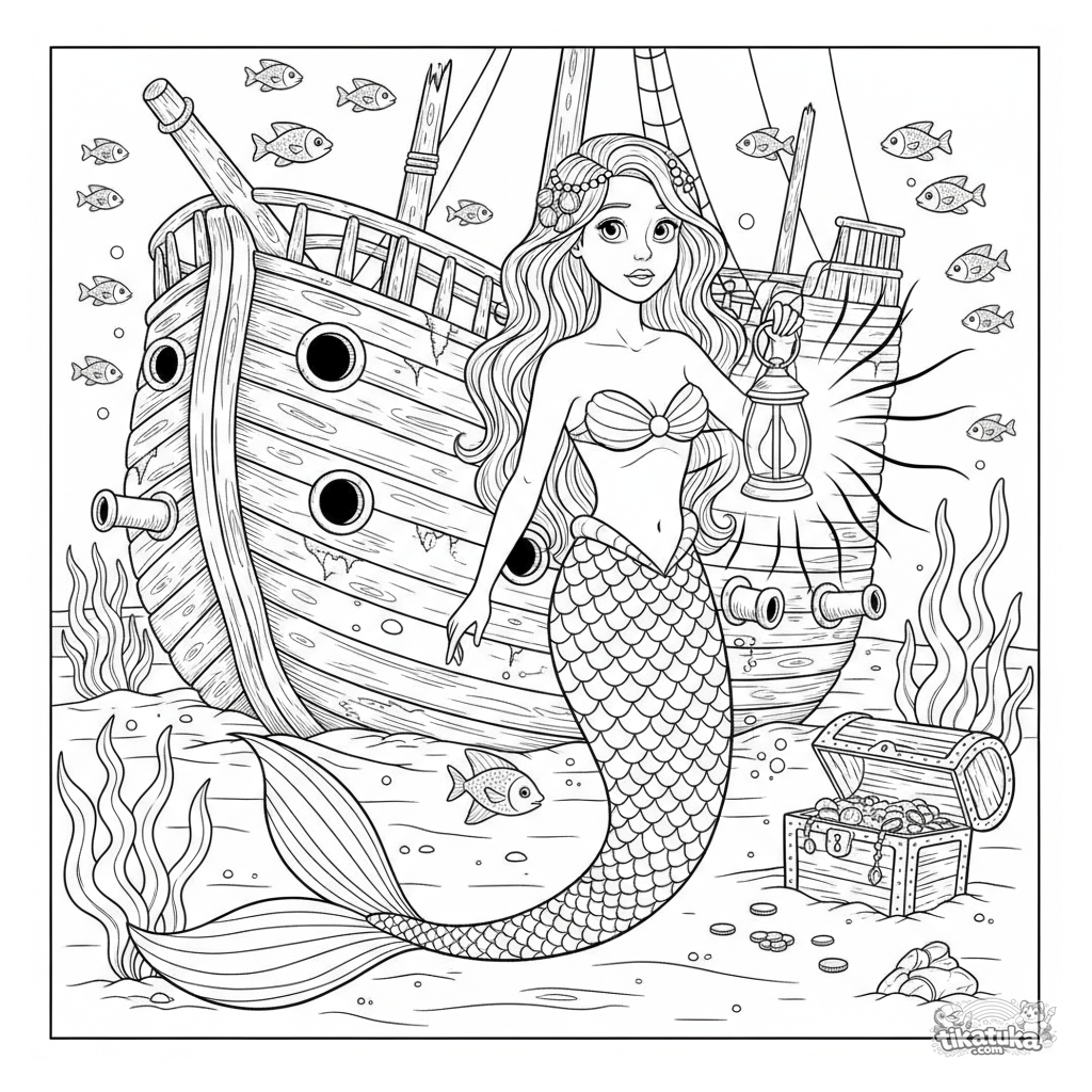 Página para colorir detalhada para crianças 10-12: uma princesa sereia com uma lanterna explora um navio de madeira naufragado no oceano profundo.