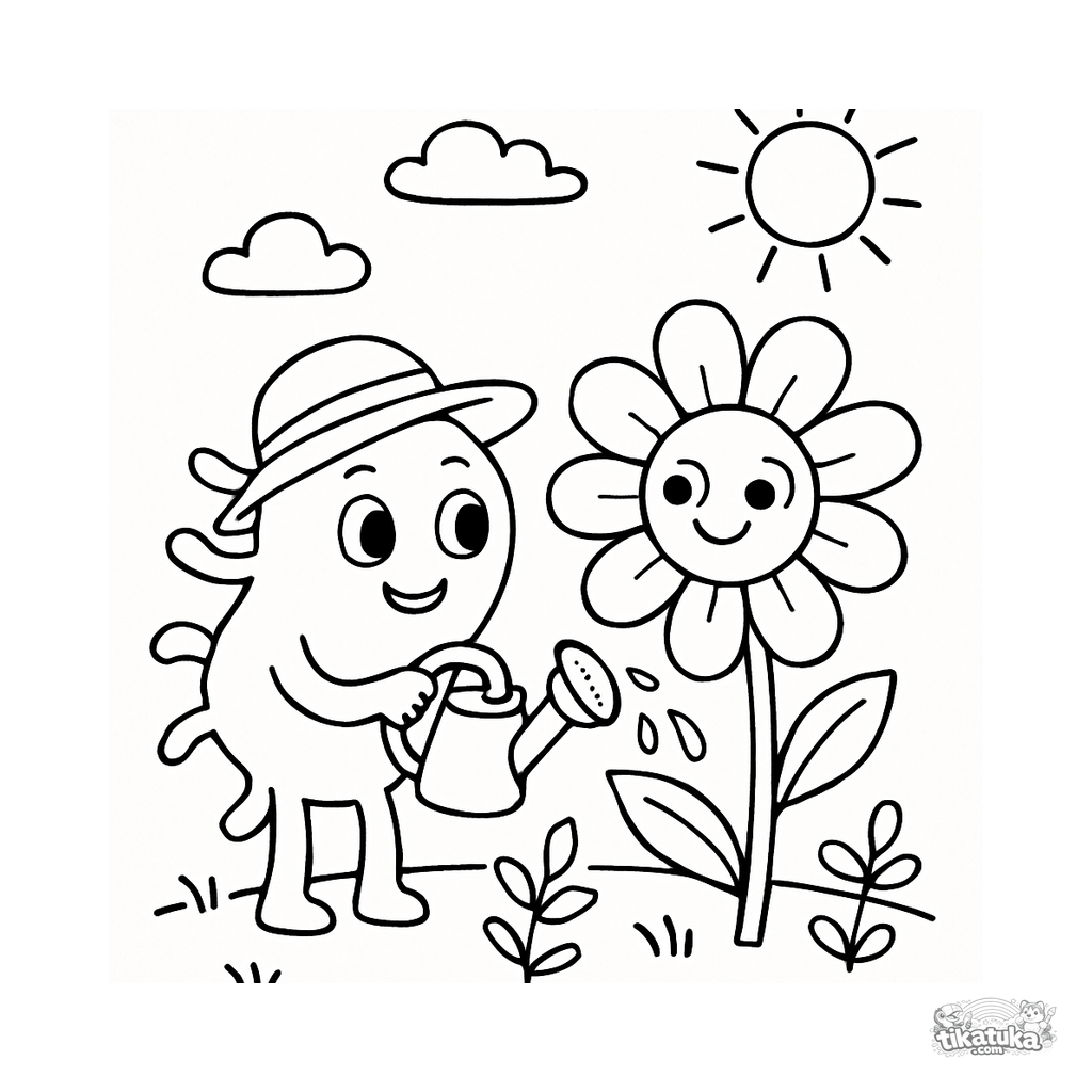 Página para colorir para crianças. Micróbio amigável com chapéu regando flor sorridente com regador, pequenas plantas e sol ao fundo. Download grátis.