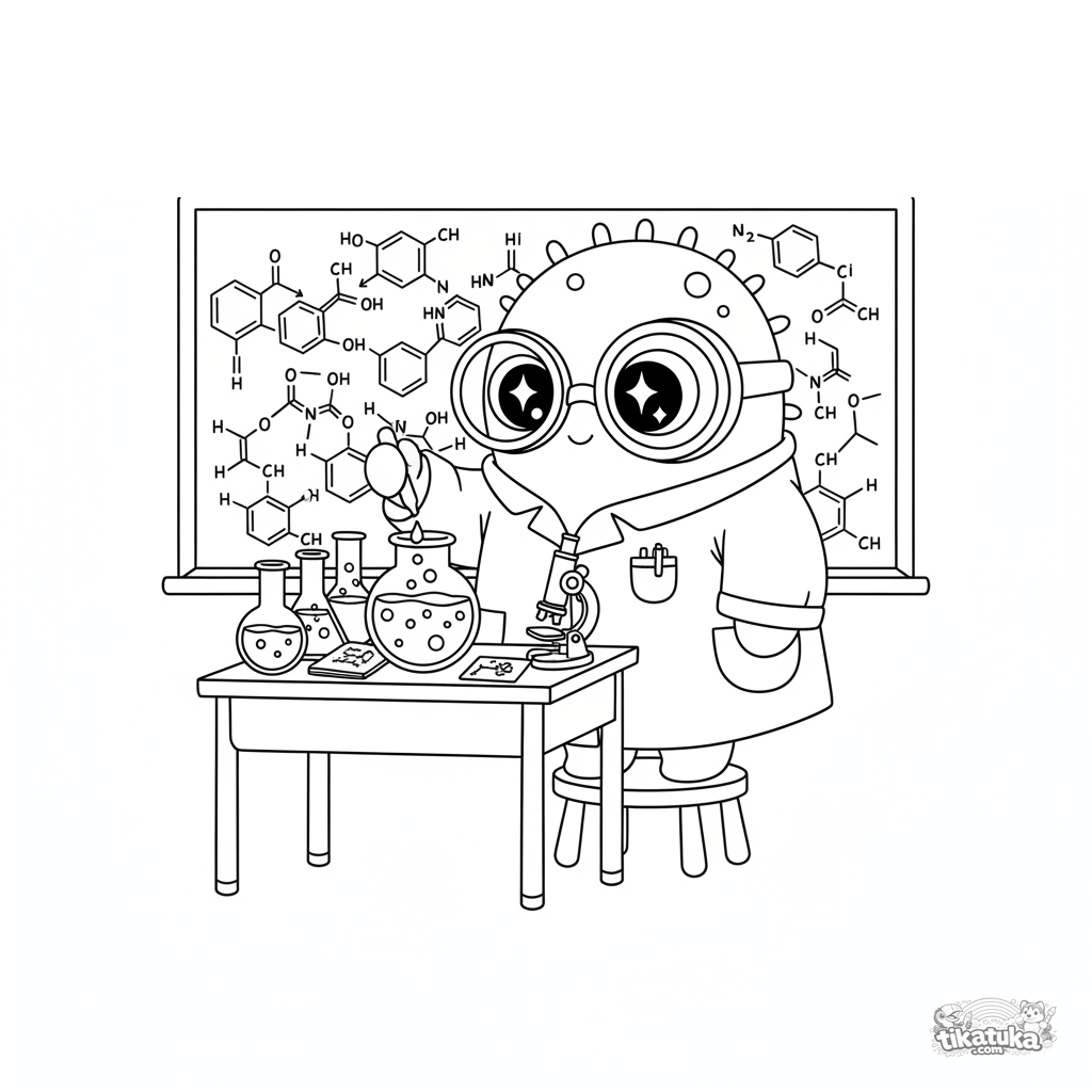Página para colorir para crianças 4-6: um micróbio curioso de jaleco faz um experimento químico em uma carteira perto do quadro com fórmulas.