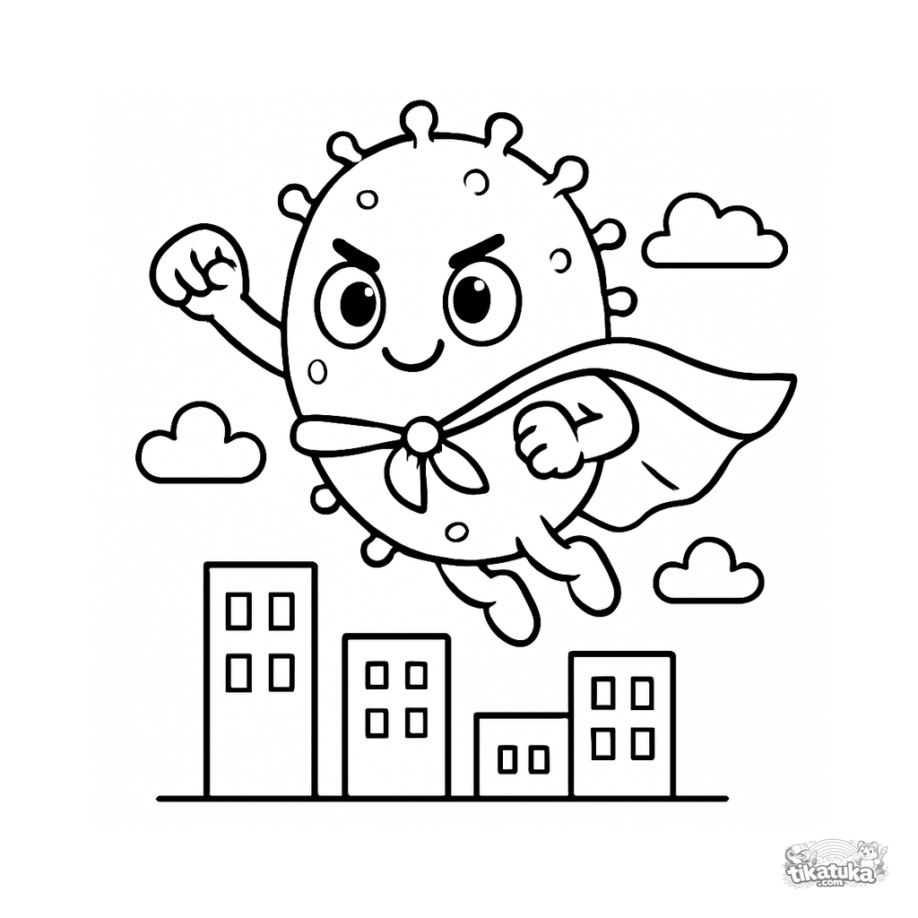 Página para colorir para crianças. Um micróbio super-herói corajoso com capa vermelha voa sobre prédios pequenos com punho estendido. Download grátis.