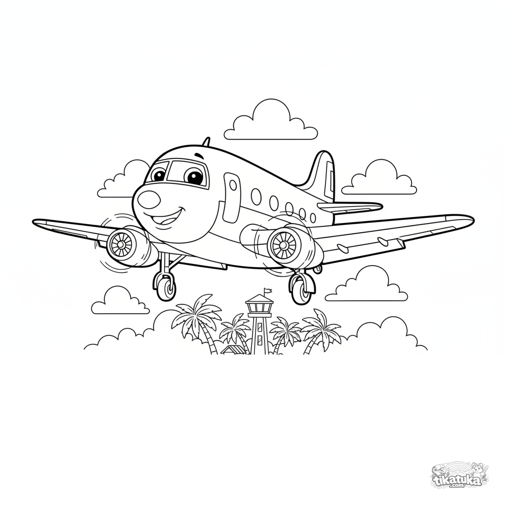 Página para colorir para crianças de 7-9 anos: um elegante avião de linha retro dos anos 50 faz sua aproximação de pouso sobre uma ilha tropical.
