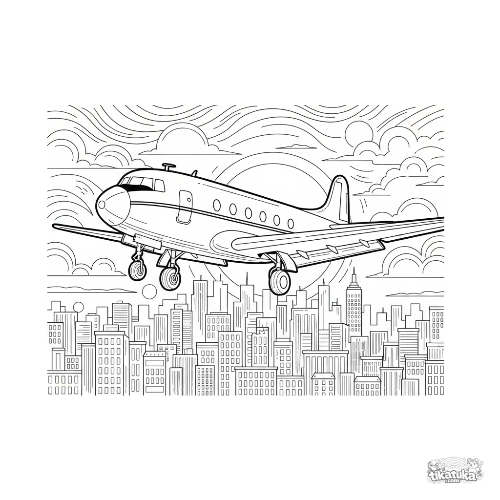 Página para colorir para pré-adolescentes de 7-9 anos: um avião de passageiros dos anos 50 faz sua aproximação de pouso sobre uma cidade ao pôr do sol. Detalhes moderados e fundo envolvente.