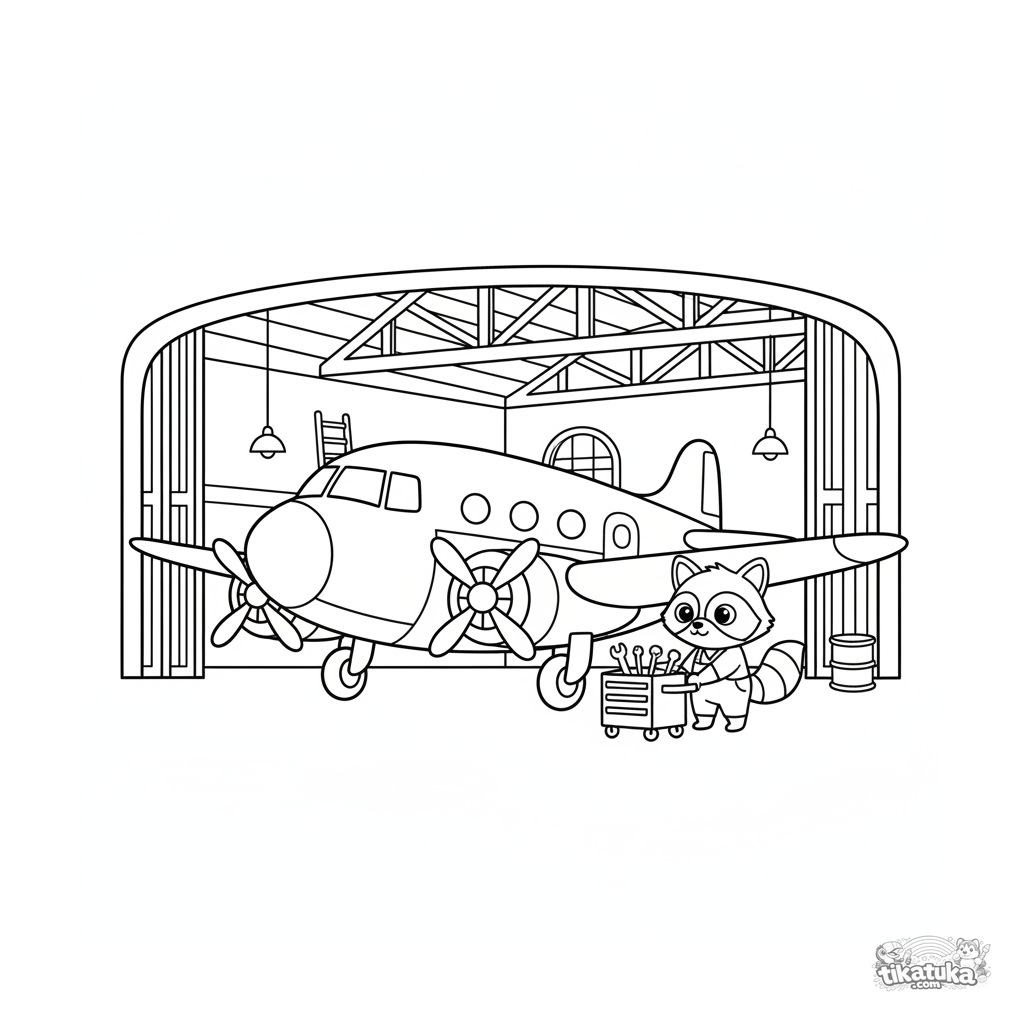 Página para colorir para crianças de 7 a 9 anos: um avião a hélice elegante dos anos 50 em um hangar. Linhas limpas, detalhes interessantes.